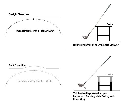 A Bent or Bending Left Wrist while Simultaneously Uncocking and Rolling will put a hump in the Flat Plane. Extending the Plane to the Ground, the Plane line will have a bend from the humped Plane rather than a straight Plane Line from a Flat Plane.